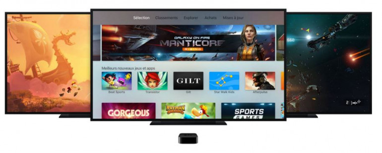 Apple avait annoncé plusieurs titres adaptés spécialement pour son boîtier. Rayman et Guitar Hero sont déjà disponibles en attendant Star Wars. On retrouve également plusieurs jeux déjà connus des utilisateurs d'iPhone comme Asphalt 8. La puce A8 qui équipe l'Apple TV se révèle globalement efficace et offre de bons graphismes sans souffrir de ralentissements. En revanche, la télécommande est parfois victime d'une certaine latence pendant les mouvements. Apple propose une manette bluetooth développée avec SteelSeries (50 euros sur l'Apple Store) pour une meilleure expérience. D'une manière générale, les jeux où l'interaction consiste dans l'essentiel à des balayages et des pressions sur le trackpad de la télécommande s'en sortent le mieux. À voir comment les développeurs tirent profit des possibilités du boîtier à l'avenir.