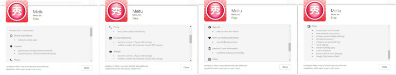 Comme l'a relevé l'expert en sécurité Greg Linares, sur Android, Meitu demande l'accès à l'appareil photo et à la mémoire. Rien d'anormal jusque là. Mais elle souhaite aussi accéder à la localisation, aux appels téléphoniques, aux informations concernant l'opérateur, au numéro d'identification du téléphone. Elle demande également la permission d'être lancée automatiquement au démarrage de l'appareil, d'empêcher sa mise en veille et de modifier les paramètres audio du terminal. Un autre expert explique que ces informations donnant la possibilité de prendre le contrôle du téléphone à distance sont envoyées sur des serveurs en Chine.