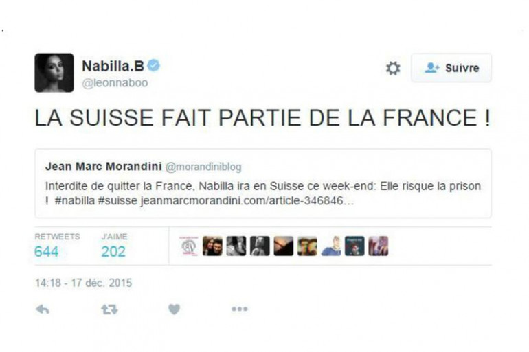 Nabilla Benattia est de retour. La jeune femme, révélée dans l'émission L'amour est aveugle sur TF1, est sous contrôle judiciaire depuis qu'elle est suspectée d'avoir malencontreusement poignardé son compagnon de l'époque en novembre 2014. Elle n'a donc pas le droit de quitter la France. Problème : Nabilla, qui vient de sortir un livre, est attendue à Lausanne vendredi 19 décembre pour en faire la promotion et faire des dédicaces. Sur Twitter, beaucoup se sont étonnés de sa présence en Suisse malgré son contrôle judiciaire. Ce à quoi l'intéressée a répondu, toujours sur Twitter : "La Suisse fait partie de la France !".