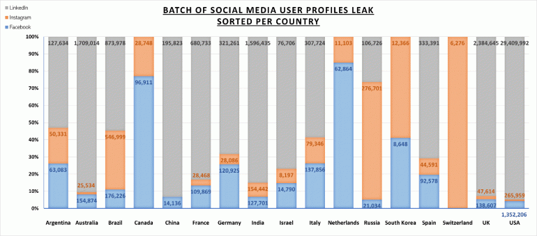 La société a dénombré parmi elles 680.733 profils français de LinkedIn, 109.869 profils Facebook complets et 28.468 profils Instagram, dont ceux de comptes influents. On recense aussi 29 millions de comptes LinkedIn et 1,3 million de comptes Facebook appartenant à des Américains.