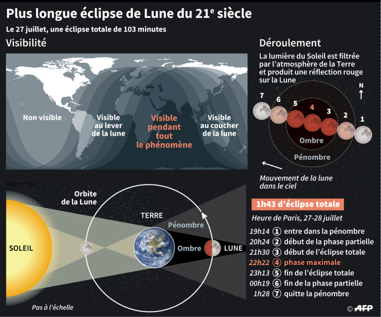 Au total, l'éclipse va durer 1 heure, 42 minutes et 57 secondes, soit presque 103 minutes. Ce qui fait d'elle la plus longue de ce XXIe siècle. Pour les plus curieux, l'ensemble de l'événement s'étendra de 19h14 à 1h28. Sinon, l'éclipse totale devrait avoir lieu entre 21h29 et 23h13. Celle-ci sera visible à partir de 21h30 à Paris, 21h32 à Lille, 21h40 au Havre, 21h42 à Rennes ou encore 21h55 à Brest.