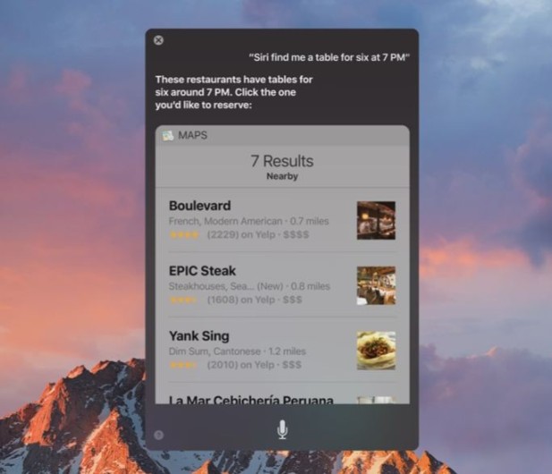 Cinq ans après son lancement avec l'iPhone 4s, l'élément le plus visible du programme d'intelligence artificielle d'Apple débarque sur Mac, en même temps qu'il s'ouvre aux développeurs d'applications externes. L'assistant vocal peut être lancé en cliquant sur son icône dans la barre de menu ou via une commande de clavier "FN + espace" et fonctionne par requête orale comme sur l'iPhone ou l'iPad.