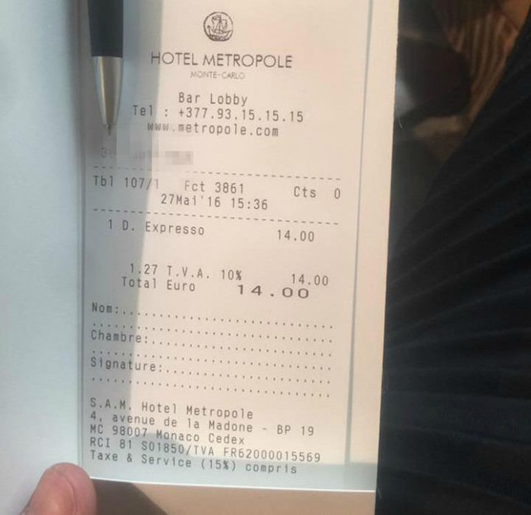 La photo de la facture d'un café à 14 euros à Monaco