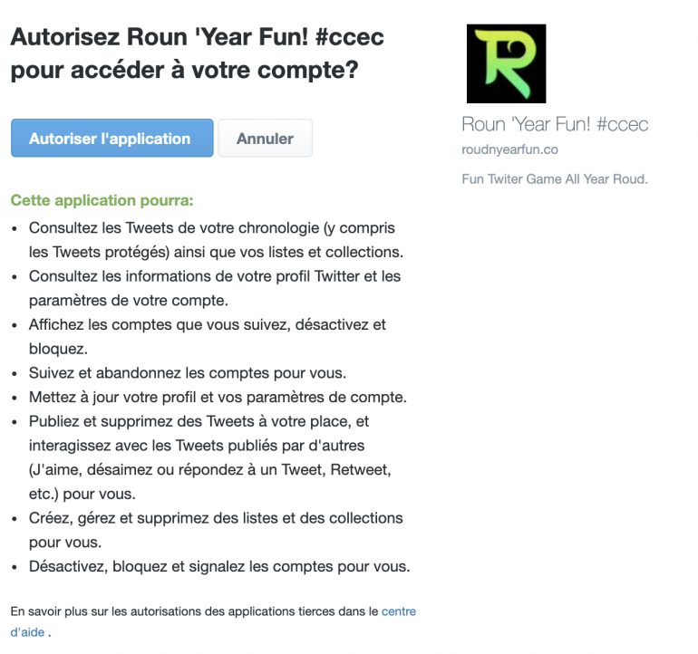 Pour afficher sa "famille Twitter", les utilisateurs doivent suivre un lien vers un site nommé Roundyear.fun qui leur demande de se connecter avec leur compte pour créer leur arbre généalogique. Cette action autorise le site à effectuer toute une série d’actions sur le compte Twitter des participants.