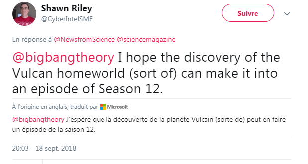 Sur Twitter, un fan de Star Trek a proposé que la découverte de la planète Vucain apparaisse dans la saison 12 de la série Big Bang Theory