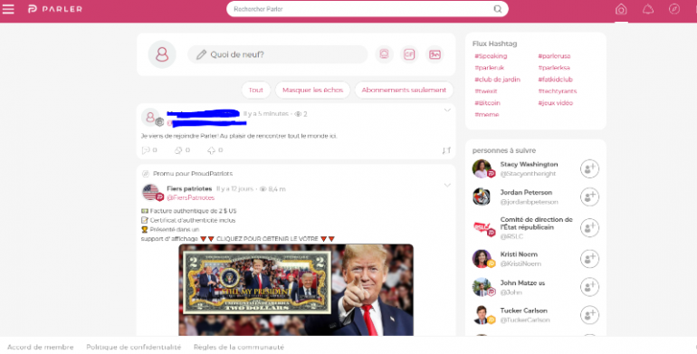Dans les faits, le service s'est imposé comme un "safe space" pour conservateurs. Dès l'inscription, le réseau social propose à ses nouveaux utilisateurs une liste de comptes à suivre afin de personnaliser leur expérience : exclusivement des porte-voix de mouvances d'extrême-droite, conspirationnistes ou libertariennes, des personnalités de l'alt-right américaine, mais aussi des comptes patriotes ou partisans de Donald Trump.