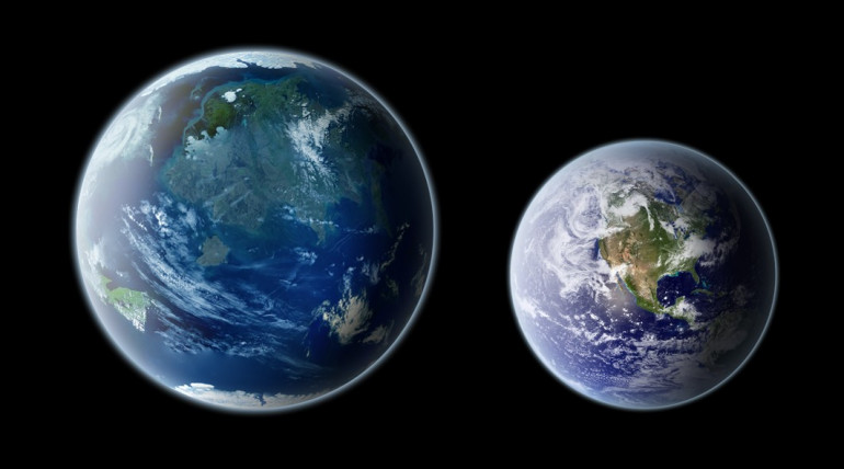Vue d'artiste de Kepler-442 b (à gauche), comparée à la Terre (à droite)