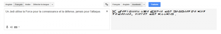 Les plus grands fans de Star Wars seront ravis d'apprendre que Google Translate propose de traduire des textes en Aurebesh la langue des peuples de l'épopée. L'alphabet syllabique est composé de trente-quatre graphèmes et quatorze signes représentants la ponctuation et les symboles.