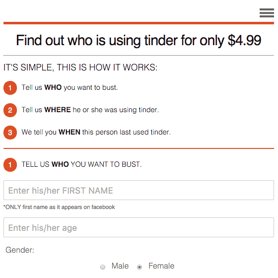 La démarche, on ne peut plus simple, se déroule en trois temps. Sur la page d'accueil du site internet, il faut d'abord renseigner le prénom, l'âge et le sexe que la personne recherchée affiche sur son compte Facebook (le réseau social étant indispensable pour créer un compte sur Tinder), puis il faut indiquer la zone géographique dans laquelle elle se trouvait.