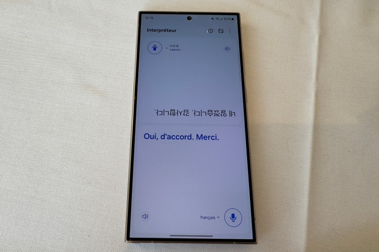 Nous avons pu essayer la fonctionnalité avant le lancement du smartphone dans le commerce. Concrètement, si vous passez un coup de téléphone à un Américain, vous pouvez parler en français et lui vous entendra en anglais via une voix synthétique.