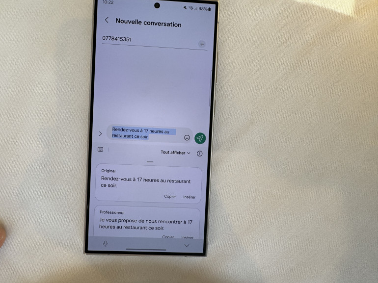 Le téléphone mobilise également l'intelligence artificielle pour retranscrire des réunions. Les conversations enregistrées via l'application Dictaphone peuvent être résumées sous la forme d'un texte et l'appareil est capable de distinguer jusqu'à 10 interlocuteurs différents. Il est possible de choisir si la synthèse doit être détaillée ou standard. Des fonctions qui étaient jusqu'ici dédiées aux logiciels bureautiques de Microsoft ou aux applications spécialisées dans la visioconférence, comme Zoom.