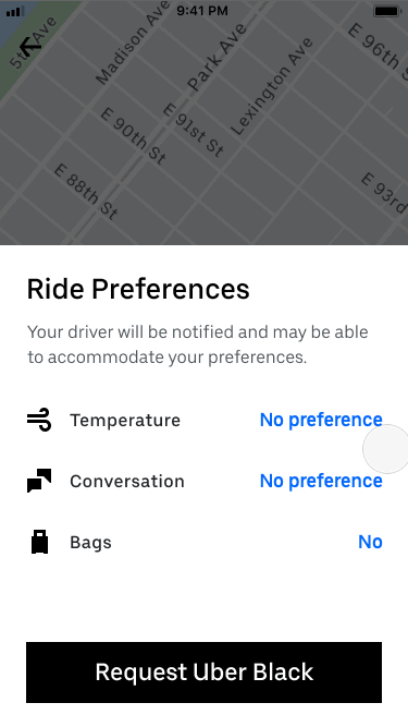 Plusieurs options sont proposées dans l'application pour éviter aux clients d'avoir à échanger avec le chauffeur. Il peuvent lui demander de charger des bagages dans le coffre ou de changer la température à l'intérieur de la voiture selon leurs préférences en quelques clics seulement. Ils peuvent aussi décaler l'heure de départ de leur course de quelques minutes sans s'acquitter du surcoût habituel.