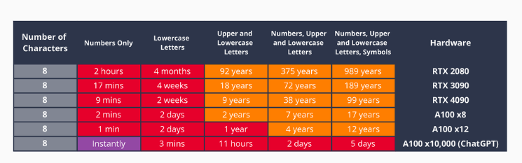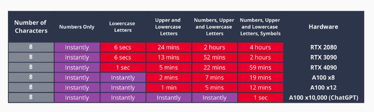 Ces derniers jours, la presse spécialisée s'est faite l'écho d'un rapport de cybersécurité aux conclusions quelque peu alarmistes. D'après la société Hive Systems, un mot de passe de 8 caractères mêlant des lettres majuscules, minuscules, des chiffres et des symboles - conformes aux recommandations des autorités américaines - pourrait être craqué en 1 heure par la dernière carte graphique RTX 4090 de Nvidia vendue 1.800 euros dans le commerce.