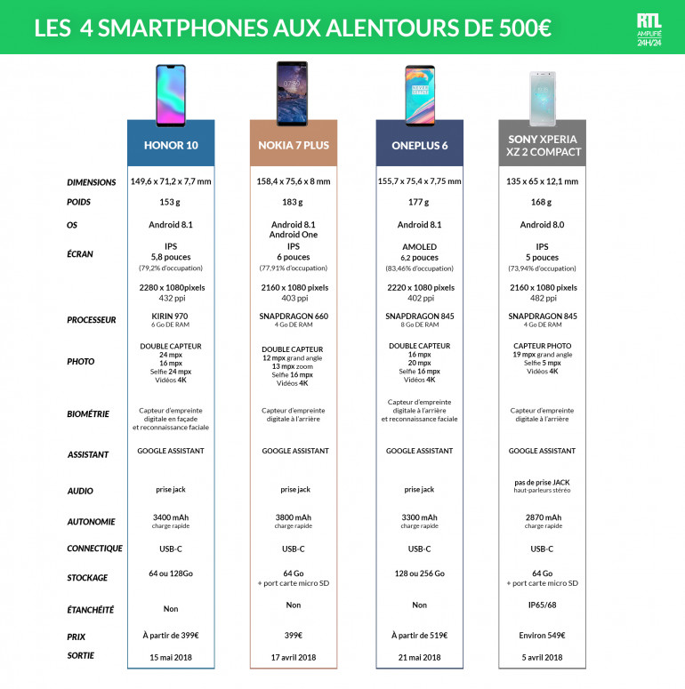 Les caractéristiques techniques du Honor 10, Nokia 7 Plus, OnePlus 6 et Xperia XZ2 Compact