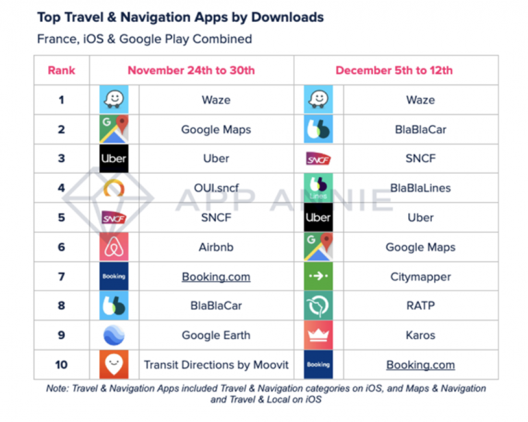 Toujours dominé par Waze, le classement met en lumière le regain d'intérêt des utilisateurs pour les services de covoiturage et de déplacements urbains. Entre le 5 et le 12 décembre, BlaBlaCar est ainsi passé du huitième au deuxième rang des applications de mobilité les plus téléchargées en France. Ses concurrents BlaBlaLines et Karos font une entrée remarquée dans le top 10 respectivement en quatrième et neuvième positions.