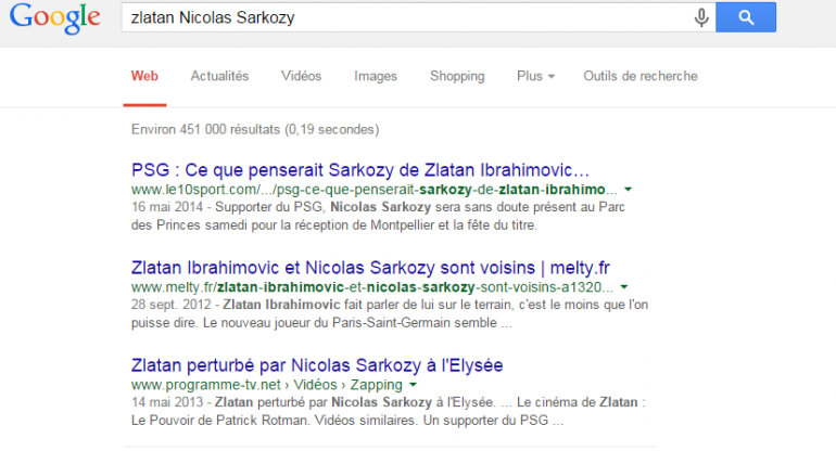 résultats Google de la requête "Zlatan Nicolas Sarkozy". Et vous