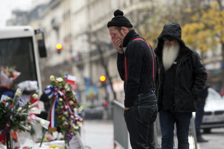 Jesse Hugues, le chanteur des EODM, se recueillant devant le Bataclan le 8 décembre