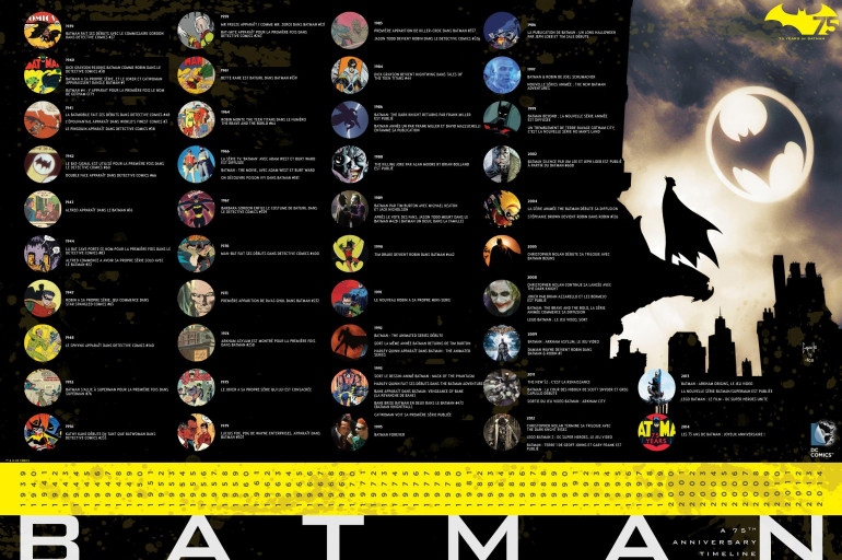 75 ans après, Batman a vécu de nombreuses aventures aussi bien en bande-dessinée qu'au cinéma. Pour l'occasion, l'éditeur français de Batman Urban Comics a publié une chronologie qui liste les principaux événements de son évolution.