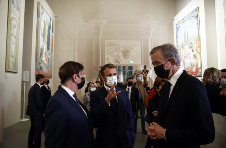 Emmanuel Macron visitant l'exposition Morozov à la Fondation Louis Vuitton le 21 septembre 2021