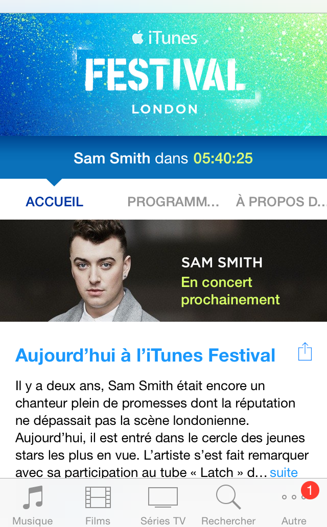 Capture d'écran de l'application iTunes Festival sur iPhone