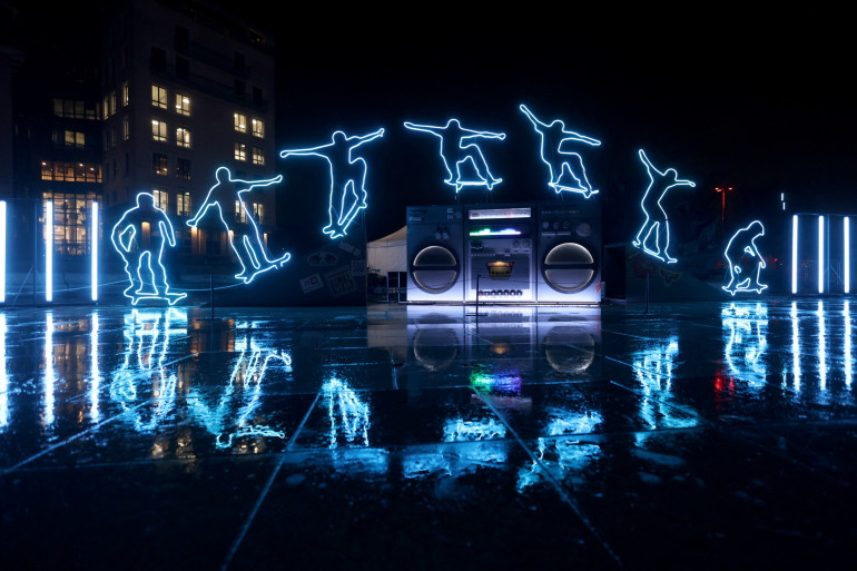 Cette photographie montre une installation créée par l’artiste visuel Remy Bergeron en hommage à 40 ans de skateboard à Lyon.