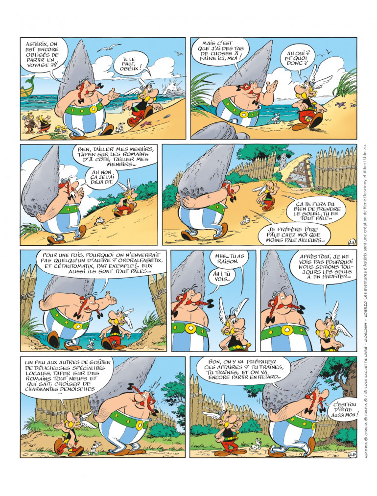 À l'occasion de ce 41e album, Didier Conrad et Fabcaro nous proposent une planche inédite, elle ne fait pas partie de l'album. "Il fallait faire une page pour annoncer le fait que c'est un album voyage. Et j'aimais bien l'idée que Astérix, quand il y a une mission à faire, il y va. Mais Obélix est un petit peu plus casanier. Il est attaché à son village, il est attaché à ses menhirs, à ses banquets, à ses sangliers. Donc, lui, il traîne un petit peu des pieds, toujours. Moi, je le ressens comme ça. C'est mon petit côté casanier, peut-être, que je projette dans Obélix. Mais j'ai l'impression que lui traîne un petit peu des pieds pour partir en voyage. Donc, c'était l'idée de poser un petit peu les deux visions."