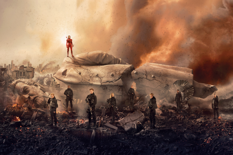 L'affiche du film est publiée à l'occasion du cinquième anniversaire de la parution de Mockingjay (La Révolte), le livre de Suzanne Collins duquel découle le dénouement d'Hunger Games. Le dernier pan de la saga, lui, sortira le 18 novembre.