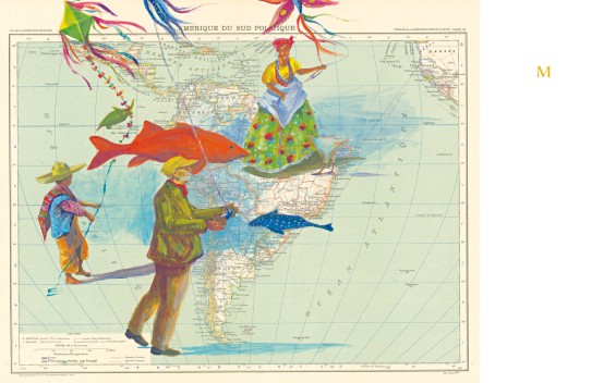 Des anciennes cartes d'atlas sur lesquelles elle a laissé danser ses couleurs et ses pinceaux. C'est un livre plein de poésie, pour faire réfléchir à l'état du monde. C'est la réédition d'un livre né il y a 7 ans, réédition revue et corrigée car le monde va encore plus mal qu'il y a 7 ans.