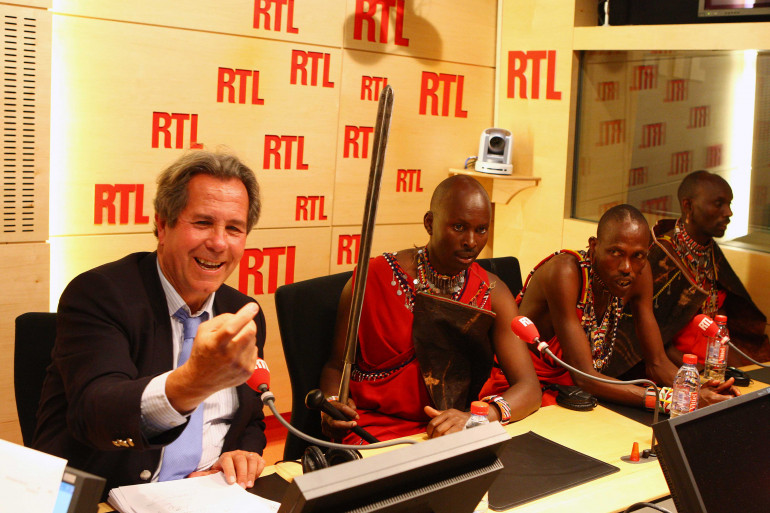 Jean-Louis Debré, le rédacteur en chef du Journal Inattendu, est en compagnie des guerriers Massaï