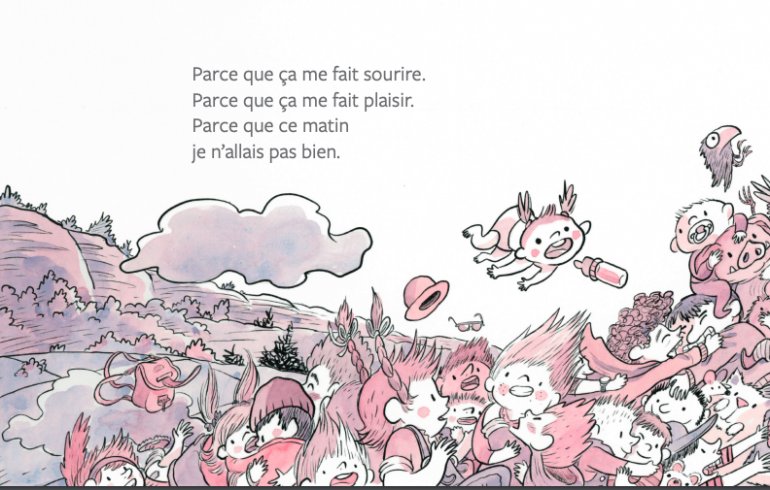 En piste donc, des enfants, croqués par le génial coup de pinceau de Guillaume Bianco... des enfants qui plongent dans un câlin géant, tous portés par les mots de Manon Fargetton, qui avec poésie, nous rappelle cette chose essentielle : "Quand plus rien ne va, tout le monde a droit à un câlin". Cet album, un vrai bijou, est à consulter chaque matin.