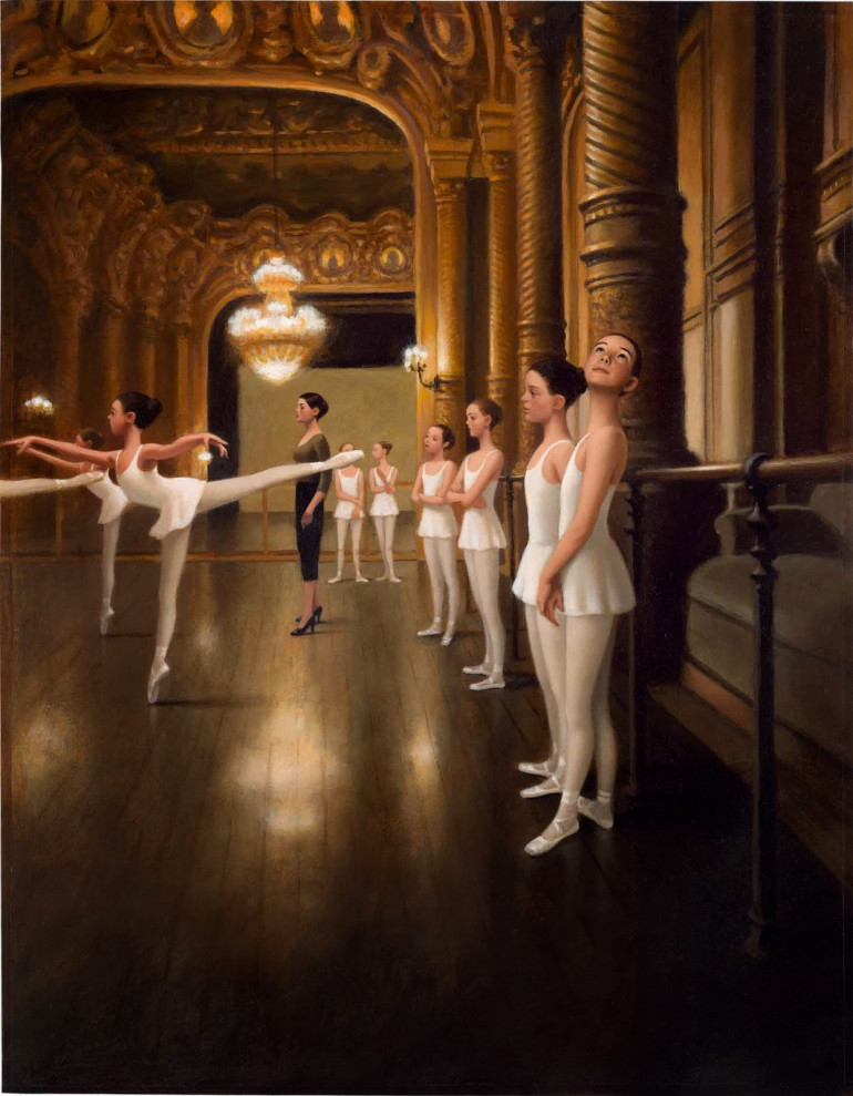 "Les somptueuses illustrations de François Roca nous entraînent parmi les vestiaires, les greniers et les salles de danse pour une visite enchantée d'un opéra. Ses tableaux, tout en jeux de lumières, suivent la simplicité et la douceur du texte ; ils restituent les gestes et postures des danseuses ainsi que l'ambiance mystérieuse d'un lieu entièrement dédié à la danse."