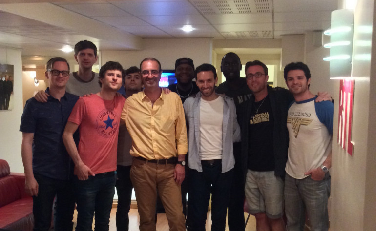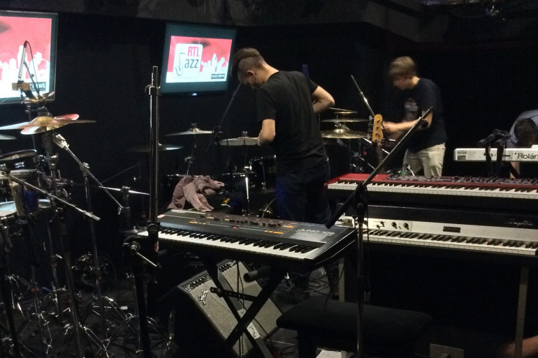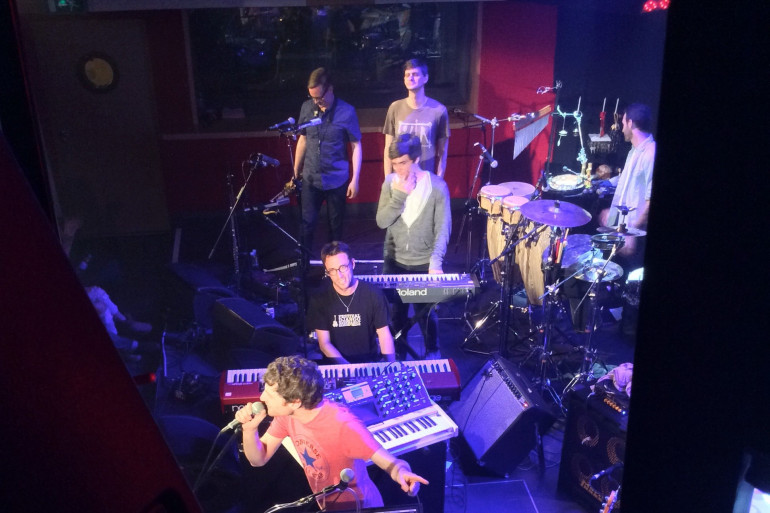 Snarky Puppy et Jean-Yves Chaperon dans le lobby du Grand Studio RTL - crédit Serge Mariani