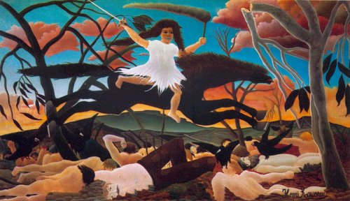 Après Mon petit livre d'art qui, en 2015, racontait déjà les dessous de 60 œuvres d'art hyper connues (trop la honte de ne pas les connaitre), voici la "suite" de ce petit livre de 19 cm sur 19 qui se glisse dans un sac : Mon petit livre d'art pour raconter l'Histoire. Le principe est bête comme chou mais il fallait y penser. Soixante œuvres d'art qui racontent soixante grands moments de l'Histoire. Page de gauche : une date. Prenons en une au hasard : 1870. Page de droite : une reproduction. Ici, La guerre ou la chevauchée de la discorde d'Henri Rousseau dit le douanier Rousseau.