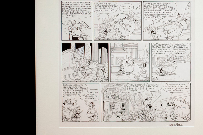 Cette planche du 18e album des Aventures d’Astérix le Gaulois, édité en 1971, mise en vente lors d'une session consacrée à la BD était estimée entre 150.000 et 200.000 euros. Le dessinateur Uderzo doit dédicacer spécialement cette planche pour l'acquéreur et Christie's a promis de ne pas prélever de commission.