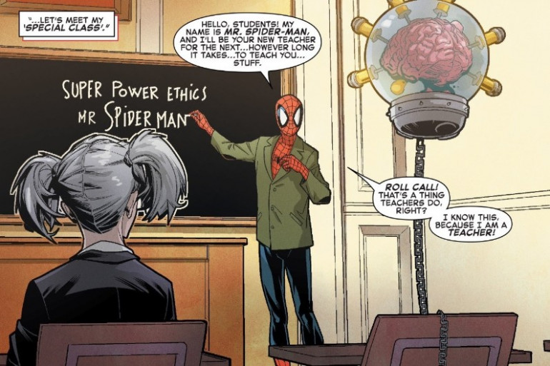 Vous ne rêvez pas, en plus d'être le protecteur de New York, Spider-Man a aussi donné des cours dans Spider-Man and the X-Men (publié entre 2014 et 2015). Après la mort de Wolverine, Spidey rejoint l'école des mutants. Il enseigne l’éthique des super-héros aux jeunes X-Men, mais partage aussi son expérience avec ses élèves.