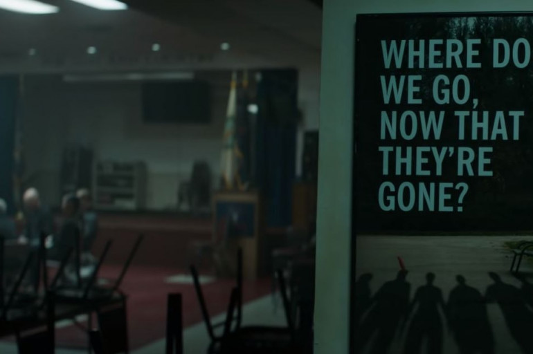 L'arrière-plan de cette scène a beau être flou, on devine qu'il s'agit d'un groupe de soutien, ou d'une réunion d'anciens militaires. On distingue en effet des uniformes kakis. Quant au panneau, "Où peut-on aller, maintenant qu'ils ont disparu ?", il confirme les traumatismes et les deuils survenus après Avengers : Infinity War