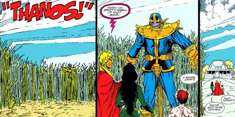 La scène finale de Thanos dans Avengers : Infinity War et son armure en épouvantail se dévoile un peu plus dans Avengers : Endgame. C'est une référence au comics The Infinity Gauntlet (Jim Starlin). Après avoir claqué des doigts, le titan se retire pour vivre comme un fermier. Sa "tranquillité" est perturbée par la visite d'Adam Warlock, qui a réussi à inverser les effets du snap, appelé The Decimation. Il faudra encore s'armer de patience avant d'en savoir plus.