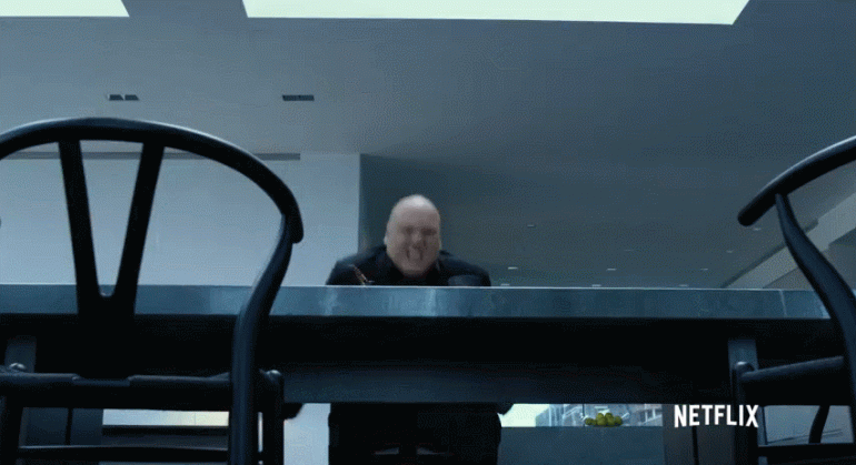 On peut le voir ici expliquer à Daredevil qu'ils ne sont pas si différents, qu'ils essayent de rendre tous deux la ville meilleure. Il est aussi sujet à des crises de colère. Le vilain ne reculera devant rien pour se débarrasser de Daredevil.