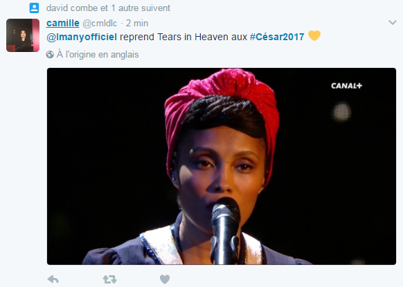 22h14 : La chanteuse Imany est montée sur scène pour rendre hommage à tous les acteurs disparus ces derniers mois. Puis une vidéo consacrée à la carrière de Michèle Morgan, disparue le 20 décembre.