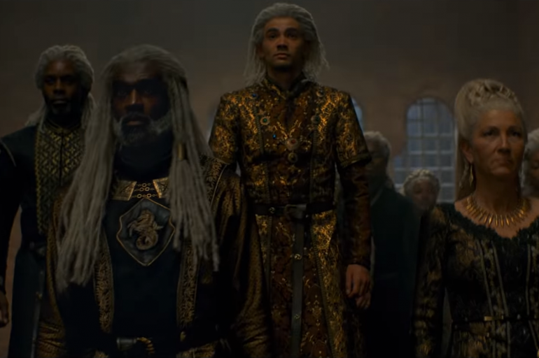 Parmi les nouveaux visages présentés dans cette courte bande-annonce vous avez sans doute repéré, Corlys Velaryon (Steve Toussaint) et ses dreadlocks argentées. Surnommé le Serpent de Mer, Corlys était le riche et puissant seigneur de la maison Velaryon de Lamarck. Il est un allié de Daemon Targaryen qu'il aide à devenir roi du Détroit. Durant la Danse des Dragons, il fut avec sa puissante flotte le principal soutien de Rhaenyra Targaryen, dont il fut un temps la Main. Son fils Laenor épousera d'ailleurs Rhaenyra. Un mariage politique qui ne va pas très bien se dérouler puisque Laenor n'a que peu d'intérêt pour la gent féminine. Le trailer nous offre d'ailleurs une image rapide de cette famille influente habillée d'or.