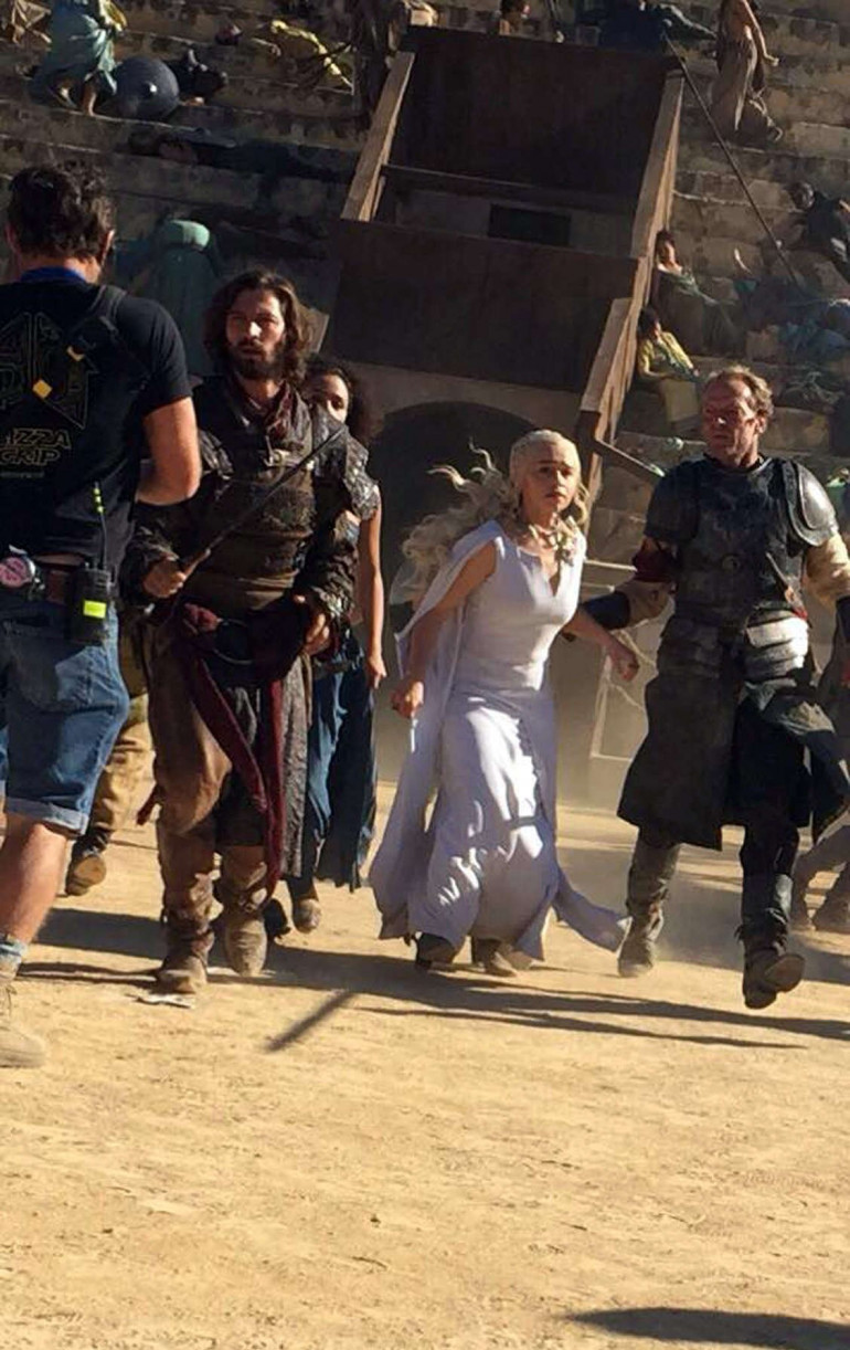 Cette scène vient en complément d'autres photos du tournage qui avaient fuité sur Internet. On y découvrait ainsi le chaos qui régnait lors d'une scène dans l'arène. On y voyait de nombreux morts et Daenerys Targaryen qui s'enfuyait en robe blanche.
