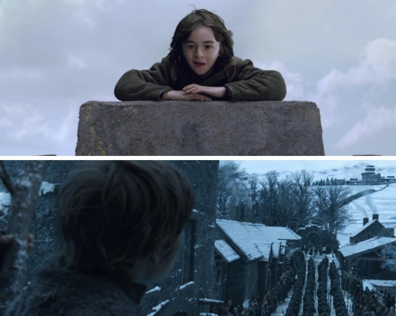 Dès les premières secondes de Winterfell, nous avons de nombreux parallèles avec L'Hiver vient, le tout premier épisode de Game of Thrones, diffusé en 2011 (et oui il y a presque dix ans). Le petit garçon de l'épisode 1 de la saison 8 qui court dans la forêt puis escalade l'arbre afin de voir les troupes de Daenerys rappelle la course du tout jeune Bran Stark dans la saison 1 sur les murailles de Winterfell. Il regarde l'arrivée de la famille royale Baratheon.