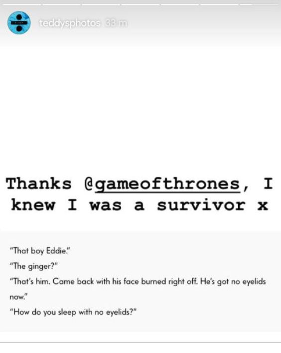 Dans la saison 7, Ed Sheeran fait une brève apparition dans Game of Thrones. Il incarne un soldat Lannister que va rencontrer Arya. On sait maintenant ce qui est arrivé à ce soldat qui était dans les rangs Lannister lors de la bataille de Hautjardin, qui se termine en barbecue géant. C'est l'une des prostituées dans la chambre de Bronn qui le dévoile : "Ce garçon, Eddie, il a eu le visage entièrement brûlé, il n’a plus de paupières." Sur Instagram, l'interprète de Shape of You a aussi réagi après la diffusion de l'épisode 1 en publiant un message dans sa story : "Merci Game of Thrones, je savais que j'étais un survivant".