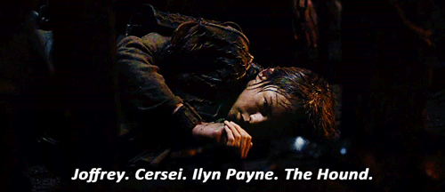 Arya a déjà tué Meryn Trant (pour l'assassinat de Syrio Forel), Rorge et Walder Frey. Joffrey est mort par la main d'Olenna Tyrell. Tywin de la main de Tyrion. Le Limier l'a sauvé à plusieurs reprises et a probablement gagné son ticket de sortie de la liste funèbre. Thoros de Myr est mort en aidant Jon. Et Mélisandre et Béric se sont sacrifiés lors de la Bataille de Winterfell.