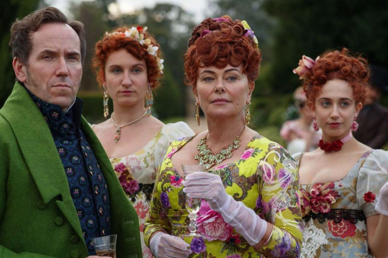 Manifestement fascinée par la papesse du genre, Jane Austen (une vraie Britannique qui a vécu la période de la Régence dont la haute société continue de nous fasciner aujourd'hui), Julia Quinn s'essaye à imiter le style de l'autrice d'Orgueil et Préjugés. On retrouve une famille nombreuse et riche dont les six enfants sont à marier. La vie sociale des Bridgerton est gérée par le fils aîné, Anthony, et la mère (et veuve) de la famille, Violet. Cette famille vit entre plusieurs résidences à Londres ou à la campagne et, cette année, une seule chose compte : marier l'aînée de la famille, Daphne (Phoebe Dynevor).