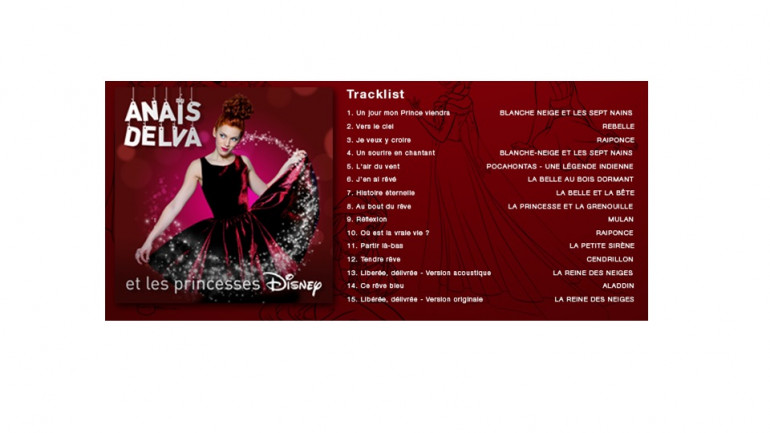 C'est donc sans surprise qu'on retrouvera Libérée, Délivrée dans la liste des 14 morceaux présents sur Anaïs Delva et les princesses Disney. Elle y reprend des chansons de films de princesses des studios Disney. Ce premier album solo de la chanteuse, âgée de 28 ans, sortira le 9 février prochain. "Je reprends des films récents comme Rebelle, La princesse et la grenouille, mais aussi des classiques comme Mulan ou La petite sirène" précise t-elle. "J'espère pouvoir faire d'autres films avec Disney" déclare t-elle enthousiaste.