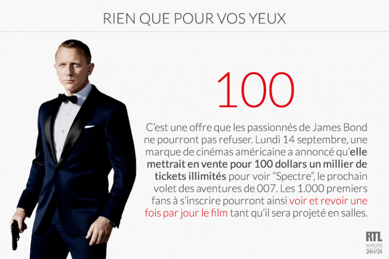 Les fans les plus acharnés vont être super ravis. Une compagnie américaine détenant des cinémas à travers tous les États-Unis met en vente depuis lundi 14 septembre des super billets permettant de voir le prochain James Bond, Spectre, autant de fois que possible. Réservées aux mille premières personnes inscrites et prêtes à débourser 100 dollars, ces places illimitées marcheront tant que le film sera diffusé dans les salles. Elles auront la forme d'une carte collector ornée du symbole du film et arriveront par courrier sous quatre à six semaines. Leur prix ne comprend cependant pas les coûts d'envoi.