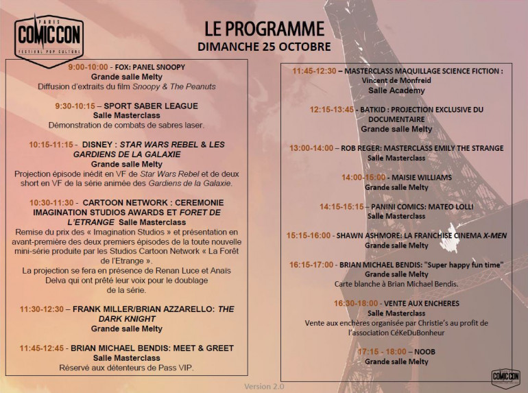 Quelques contenus exclusifs seront dévoilés. L'épisode 4 de la saison 2 de Star Wars Rebels sera montré tout comme les dix premières minutes de la série animée Les Gardiens de la Galaxie (en 2016 sur Disney XD). Le documentaire sur la tendre histoire de Batkid (un enfant américain atteint d'une leucémie rêvait de devenir Batman, son souhait a été exaucé grâce à une incroyable mobilisation de toute une population, ndlr) sera projeté dans son intégralité. Le documentaire de Philippe Guedj et Philippe Roure sur l'univers Marvel sera également dévoilé en partie avant sa diffusion sur Ciné +.