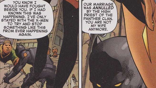 Malheureusement, ils divorceront en 2012, après le combat des X-Men contre les Avengers. Le Wakanda paiera un lourd tribut de cet affrontement et T'Challa reprochera à Storm d'avoir choisi le camp des mutants. Il fera annuler leur mariage.