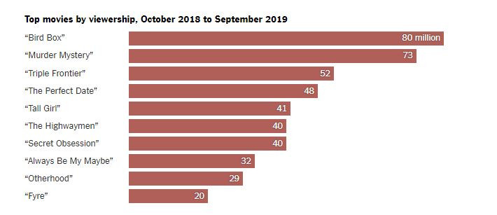 Là aussi, c'est presque sans surprise que l'on découvre LE film le plus regardé de 2018-2019 sur Netflix. 80 millions de "vues" Netflix ont visionné Bird Box,le thriller horrifique emmené par Sandra Bullock. Depuis le 21 décembre 2018, soit un mois après sa sortie, le géant du streaming enregistre le plus gros succès de son histoire. Une intrigue terrifiante, une médiatisation avec le "Bird Box Challenge" et un "effet de masse" ont permis le succès record de ce film. Arrivent ensuite la comédie Murder Mystery (73 millions) servie par Jennifer Aniston et Adam Sandler, et Triple Frontier (52 millions), un thriller tout en testostérones avec Ben Affleck, Charlie Hunnam, Oscar Isaac, Garrett Hedlund et Pedro Pascal. Les comédies teen-romantiques The Perfect Date et Tall Girl ont aussi été des succès avec 48 et 41 millions de "vues".